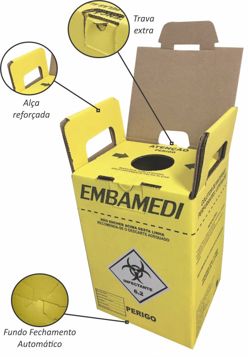 O Coletor Embamedi tem como finalidade o descarte de materiais perfurocortantes provenientes de hospitais, laboratórios, consultórios médicos, odontológicos, veterinários, farmácias, etc.